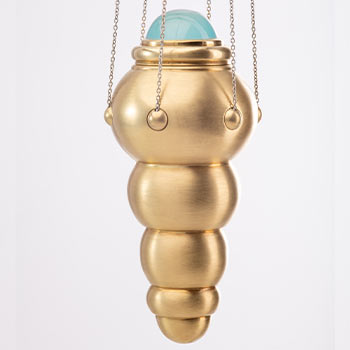 Im Bild: Mein Meisterstück von 1999 - ein handgefertigter Duftflakon aus 750/000 Gelbgold, Aquamarin und Platinketten.
